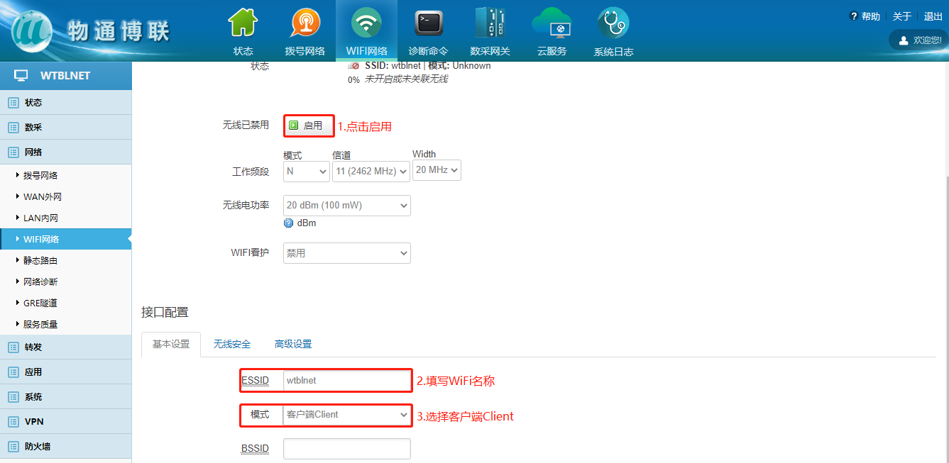 下載中心 視頻中心 常見問題 售后服務 工業網關 設備快線 數據云平臺 聯網設備 問答百科 工業智能網關如何連接wifi熱點? 時間:2022-10-26 09:15:30 點擊:6551 關鍵詞:工業智能網關,wifi 問題:工業智能網關如何連接wifi熱點? 回答: (1)電腦通過網線接入到網關LAN口,瀏覽器輸入192.168.2.1默認地址 (2)登陸網關配置界面選擇WiFi網絡 (3)點擊WiFi界面修改—進入WiFi配置界面 (4)啟用WiFi—填寫ESSID(WiFi名稱)—模式選擇客戶端Client (5)點擊無線安全—輸入WiFi密碼 注意:WiFi獲取到的IP網段與網關LAN口的IP網段不能重復! 上一篇:工業智能網關如何更新程序和固件? 下一篇: 工業智能網關如何使用流量卡上網?