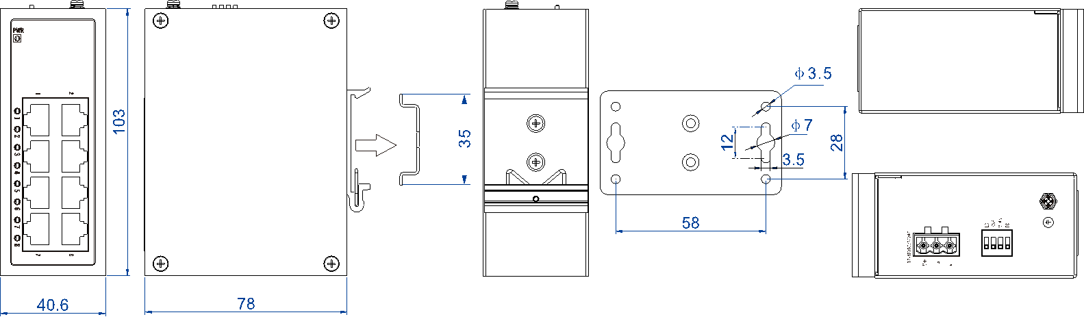 外殼:IP40防護等級,金屬外殼 安裝:DIN導(dǎo)軌式或壁掛式安裝 尺寸(寬×高×深):40.6mm×103mm×78mm |