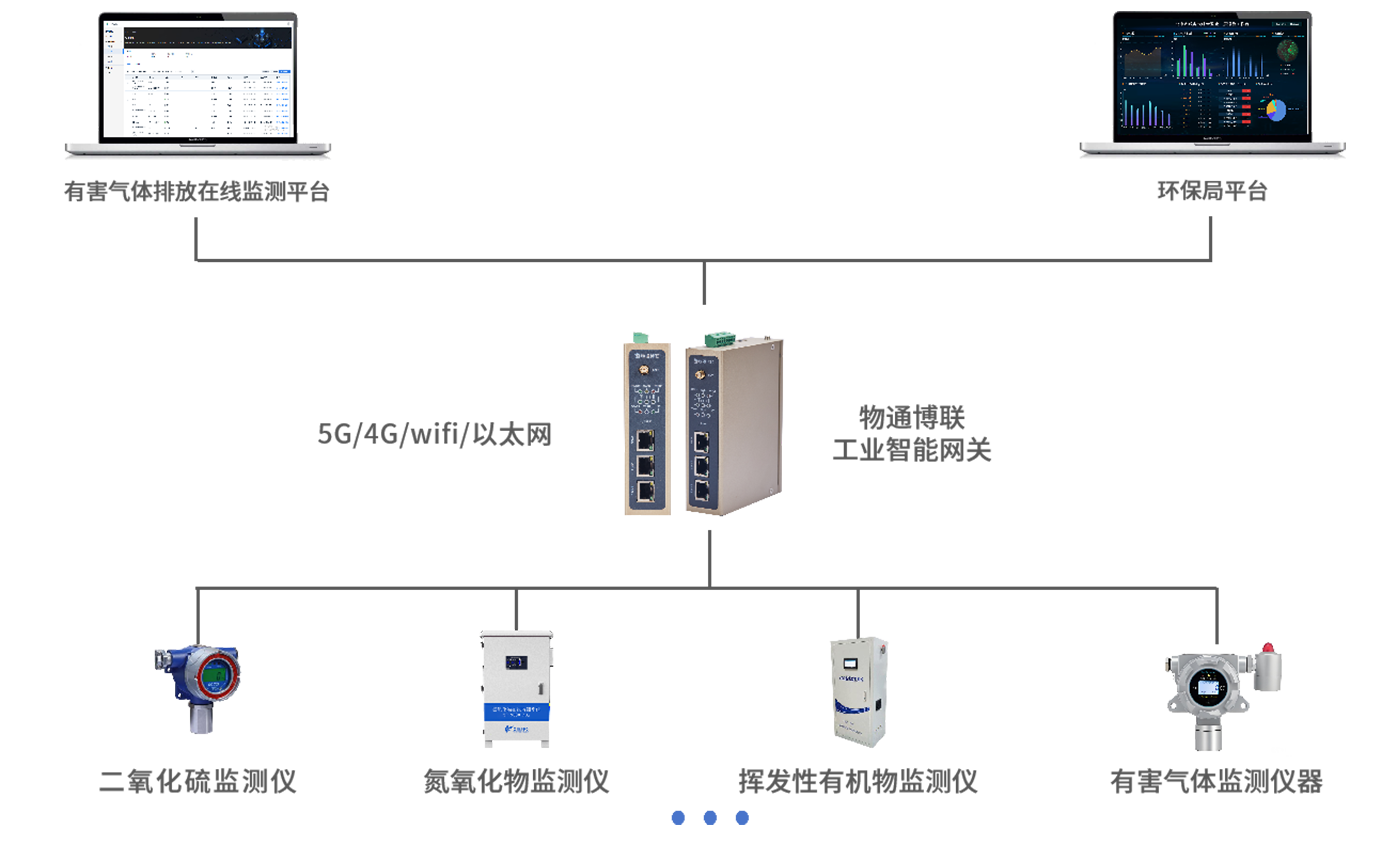 在可能產生有害氣體排放的區域安裝各類有害氣體監測儀器(如二氧化硫監測儀、氮氧化物監測儀、揮發性有機物監測儀等),通過物通博聯的工業智能網關將采集到的有害氣體濃度數據實時傳輸至有害氣體排放在線監測平臺。平臺對數據進行實時分析和存儲,當有害氣體濃度超標時立即發出預警,并將相關信息發送給環保監管部門和企業管理人員。同時,平臺具備數據統計分析功能,可對排放趨勢進行分析、對區域污染情況進行評估,支持遠程監管控制和數據共享發布。