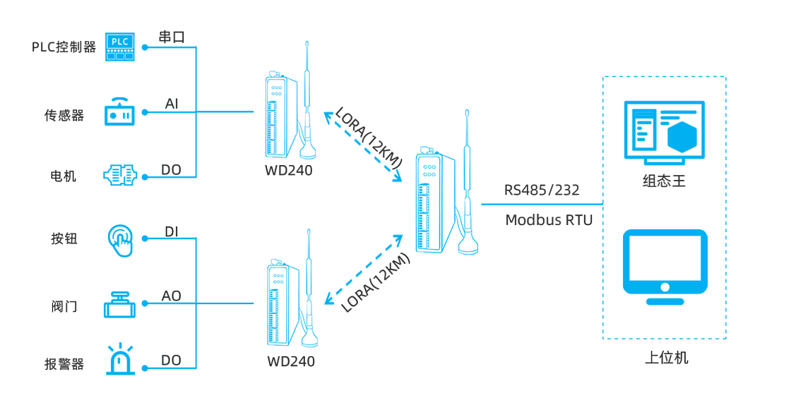 | 示例 | WD240-LM0844-485(8AI-4DI-4DO,國內頻段:410~493MHz,485串口) WD240-LM0484-232(4DI-4AI-4DI-4RO,國內頻段:410~493MHz,232串口) WD240-LM0448-485(4DO-4AI-4DI-4RO,國內頻段:410~493MHz,485串口) WD240-LM2644-232(2AO-6AI-4DI-4RO,國內頻段:410~493MHz,232串口) WD240-LM0844-485(8AI-4DI-4DO,海外頻段:850~930MHz,485串口) WD240-GM0844-485(8AI-4DI-4DO,4G CAT1,485串口)等 |