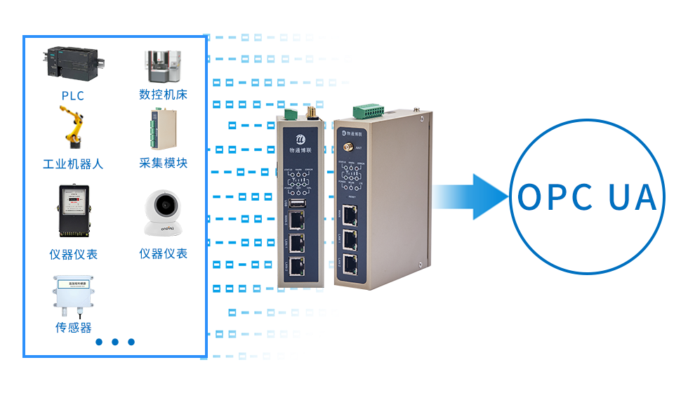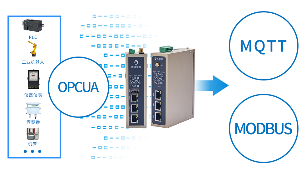 物通博聯OPC網關具有設備聯網、數據采集、協議解析、邊緣計算、云端接入等功能,支持OPC UA協議解析數據采集,能夠連接到PLC、儀器儀表、傳感器、數控機床、DCS、SCADA等,實時采集數據并通過Modbus/MQTT協議傳輸到云平臺或本地上位機,支持采集設備數據通過OPC UA協議轉發給組態軟件、上位機軟件、云平臺,實現設備遠程監控、遠程管理。