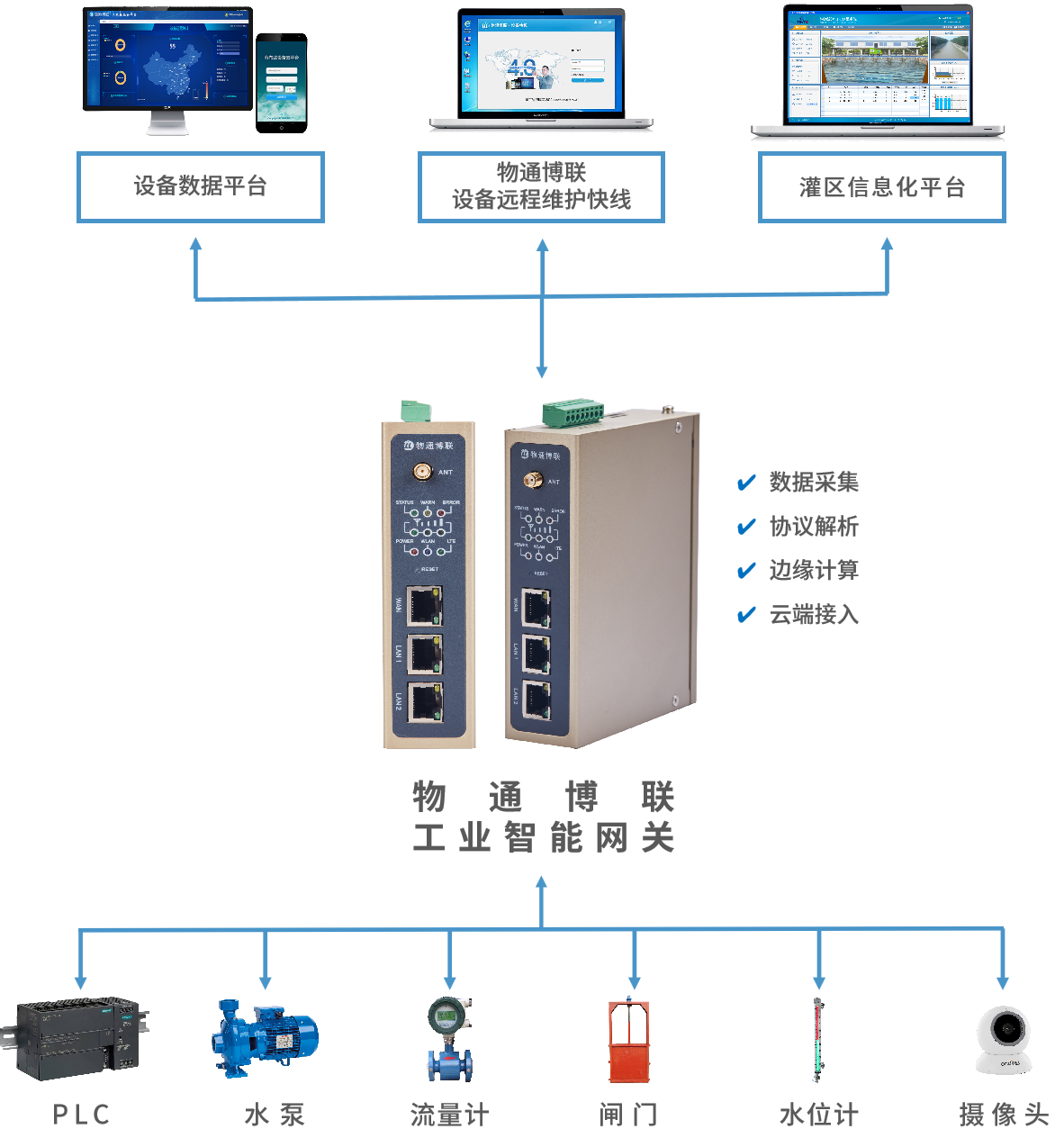 網關支持采集PLC、傳感器、儀器儀表、攝像頭等設備數據,并提供5G/4G等無線通信方式對接到智慧灌區信息化平臺中。