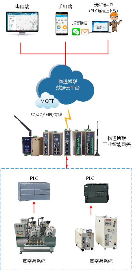 半導體工業(yè)正在逐步實現(xiàn)自動化生產,真空泵系統(tǒng)通過PLC自動化控制已經得到廣泛應用,因此只需要將物通博聯(lián)工業(yè)智能網關接入到PLC,就能實時采集PLC內真空泵的工作參數(shù)(壓強、溫度、振動等)并通過5G/4G/WIFI/以太網等方式上傳到云平臺或本地上位機,進而實現(xiàn)設備遠程監(jiān)控、故障報警、遠程控制及遠程維護等功能。
