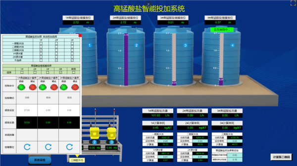 基于云組態功能還原加藥工藝流程,快速查詢高錳酸鉀儲液罐、計量泵、配水池等設備狀態與工藝參數,一目了然。