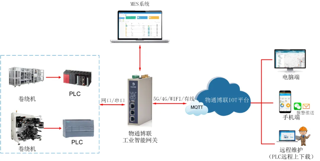 現場卷繞機PLC通過串口/網口接入物通博聯工業智能網關,網關能夠進行數據采集、協議解析和邊緣計算等功能,將采集到的數據(設備狀態、運行參數、工藝參數等),通過5G/4G、WiFi或以太網等網絡方式上傳至通博聯IOT平臺MES系統中,為企業各級管理人員、生產人員和維護人員提供各種應用服務,實現對鋰電池卷繞機設備的實時監控、故障告警、運維管理和數據分析等,助力企業提升生產效率、降低運營成本。
