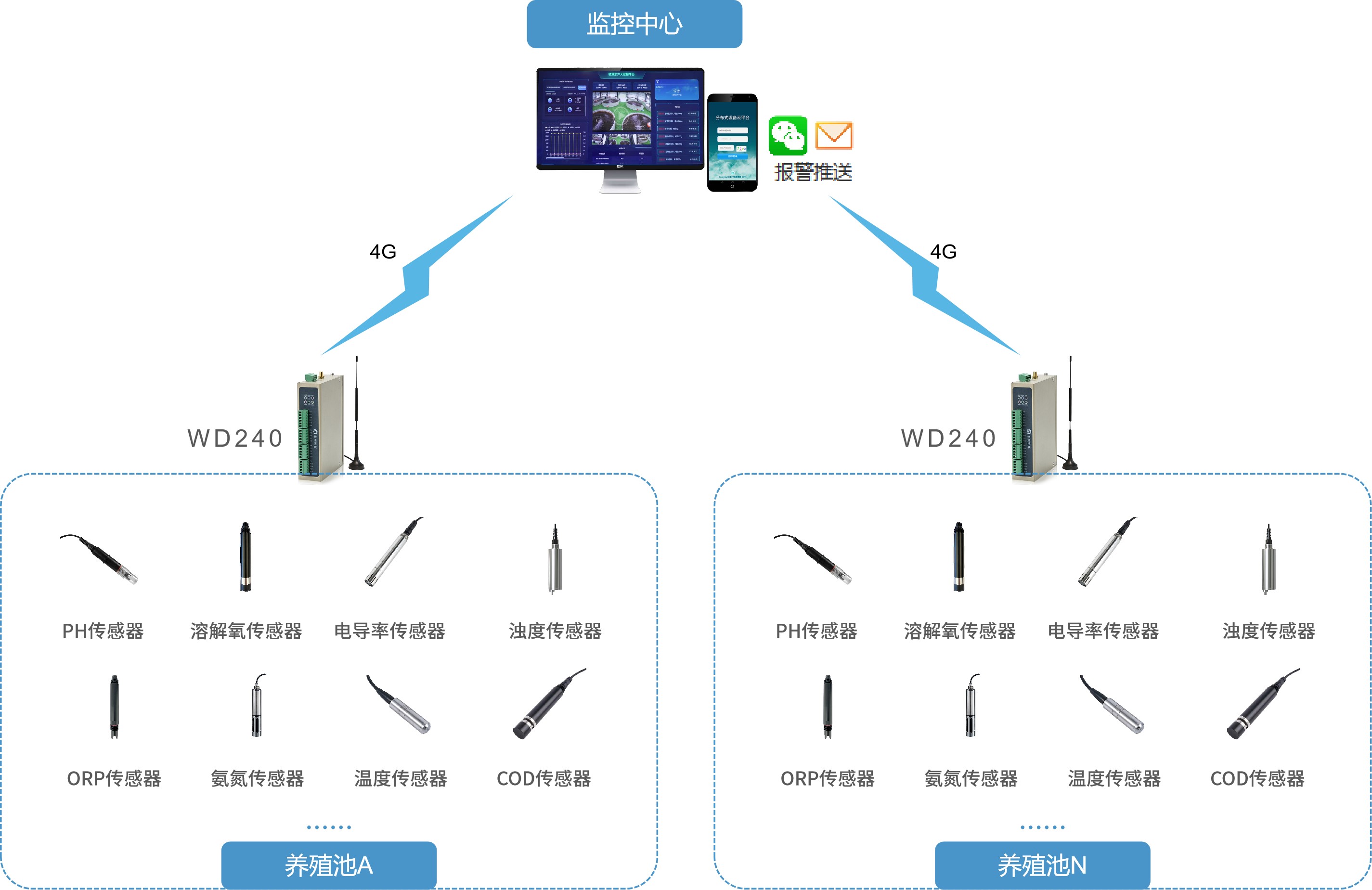 WD240數據采集終端具備多路IO數據采集和一路RS323/RS485串口,能夠接入溫濕度傳感器、pH值傳感器、溶解氧傳感器等設備,實時采集水質參數對接到智慧養殖管理平臺。